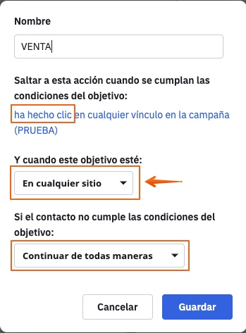 Esto es muy útil, por ejemplo, cuando estás lanzando 5 correos de venta encadenados con tiempos de espera entre ellos. Si el suscriptor ya compra en el primer correo, ¿qué sentido tiene que siga viendo los emails de venta? Lo lógico es que se los salte. Pues en este caso, tendrías que crear un objetivo en el que digas que si el suscriptor ha hecho clic en ese enlace Y ha visitado la página de gracias que tengas para ese producto entonces lo ha cumplido y puede saltarse la secuencia. La configuración sería algo así (eligiendo el enlace en concreto en vez de “cualquier vínculo”, y añadiendo la URL de la página de gracias en la condición):