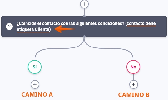Todo lead que se vaya por el CAMINO A será el que sí tenga la etiqueta Cliente. Y esto nos permitiría enviarle un correo específico para esas condiciones, echarlo de la automatización, hacer que entre en otra, que tenga que esperar más días para recibir el contenido siguiente, etc. El que se vaya por el CAMINO B será el que no tenga la etiqueta Cliente.
