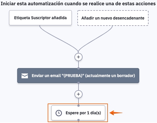 En esta captura, cuando a algún lead se le añade la etiqueta “Suscriptor” en el mismo momento se le envía el email (PRUEBA) y luego hay 1 día de espera hasta que se ejecute la siguiente acción.