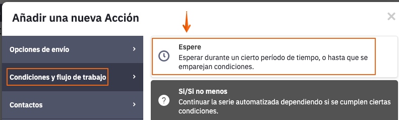 Añadir tiempo de espera es tan sencillo como añadir un nuevo correo a la automatización. Haz clic en el símbolo + y luego en la parte izquierda elige “Condiciones y flujo de trabajo” > Espere: