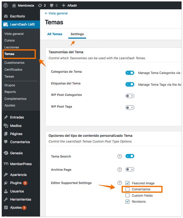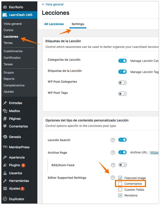 Si quieres habilitar los comentarios en las lecciones, entonces debes dirigirte a Learndash > Lecciones > Settings > Opciones del tipo de contenido personalizado Lección y activar la casilla correspondiente: