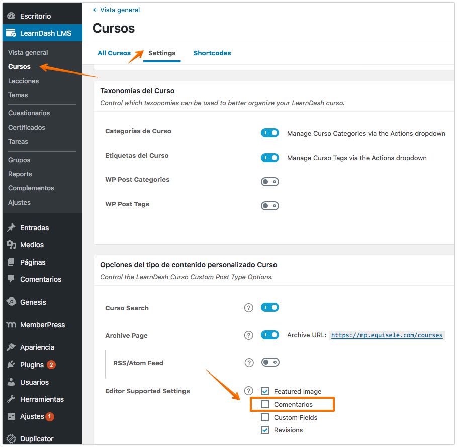 En el caso de querer activar los comentarios en el curso principal – que no recomendamos – puedes dirigirte a Learndash > Cursos > Settings > Opciones del tipo de contenido personalizado Curso y activar la casilla correspondiente.
