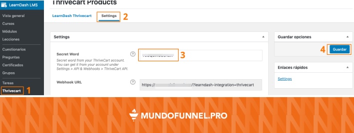 - Entra en tu WordPress y dirígete a LearnDash LMS > ThriveCart > Settings y pega el código que acabas de copiar en el campo “Secret word“.
