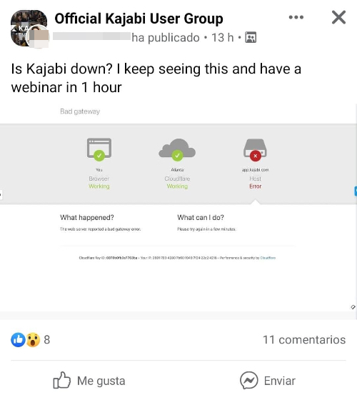 Por si lo dudas, un pantallazo de ayer mismo en el grupo oficial de Facebook de esa plataforma: una usuaria a la que no le hizo mucha gracia porque estaba a 1 hora de lanzar un webinar para vender su formación. Otro tuvo peor suerte, que lo cogió en pleno lanzamiento.