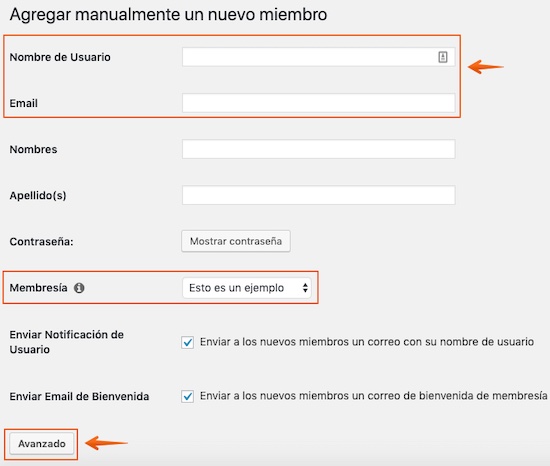 En la siguiente pantalla tendrás que completar, como mínimo, el campo de correo electrónico y nombre de usuario. Que introduzcas un nombre para identificar a tu cliente sería lo apropiado, pero puedes no introducir su apellido. Fundamental indicar a qué membresía quieres darle acceso: