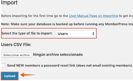 Tras activar el plugin, dirígete a MemberPress > Import y en el desplegable marca la opción Users.