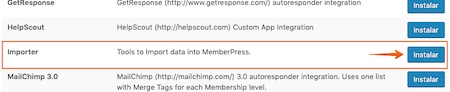 Primero necesitaremos instalar la extensión de MemberPress para realizar importaciones. Para ellos nos dirigiremos a MemberPress > Activar > Add-Ons y pulsaremos en Instalar en la extensión denominada Importer.