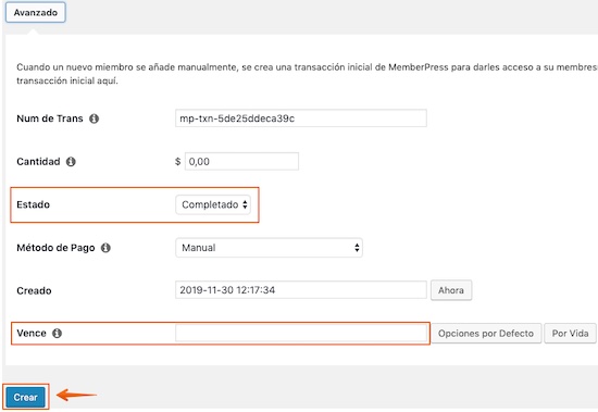 Si no quieres que suceda eso, tendrás que hacerlo en dos pasos: crear el usuario primero, sin desplegar el botón avanzado; y posteriormente crear la transacción des del apartado MemberPress > Transacciones.