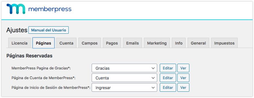 02. Realiza la configuración básica. No es necesario definir ahora ajustes de las pasarelas de pago. Por lo tanto, te centrarás en lo esencial para lo que tienes que ir a Memberpress > Ajustes. Tendrás que haber creado previamente – o dejar a Memberpress que lo haga si es la primera vez que lo instalas en tu web – las páginas de “Gracias”, “cuenta” e “Ingresar”.