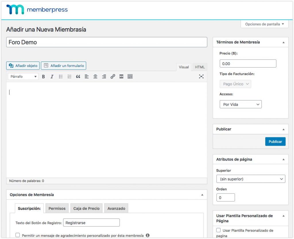 03. Ahora pasarás a crear una membresía para proteger el contenido. Puedes seguir los pasos que encontrarás en el artículo enlazado. La llamaremos “Foro Demo” y dejaremos el resto de parámetros por defecto.