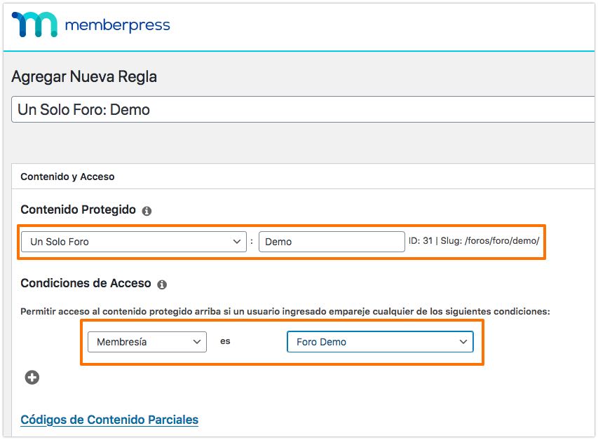 Vamos a hacer lo segundo. Entonces solo te quedaría el paso final de elegir la membresía que lo va a proteger. En nuestro caso la llamamos “Foro demo”. Y quedaría de esta forma: