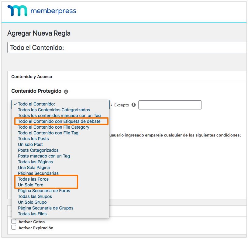 Las reglas de memberpress te permiten crear, como su propio nombre indica, reglas de protección para diferentes tipos de contenido de WordPress en cualquier lugar de tu sitio web. De esta forma, por ejemplo, podrías proteger determinadas categorías, etiquetas, posts específicos o incluso, como es nuestro caso, un Custom Post Type – tipo de contenido – creado por bbPress y que nosotros hemos llamado /foro/ en pasos anteriores.