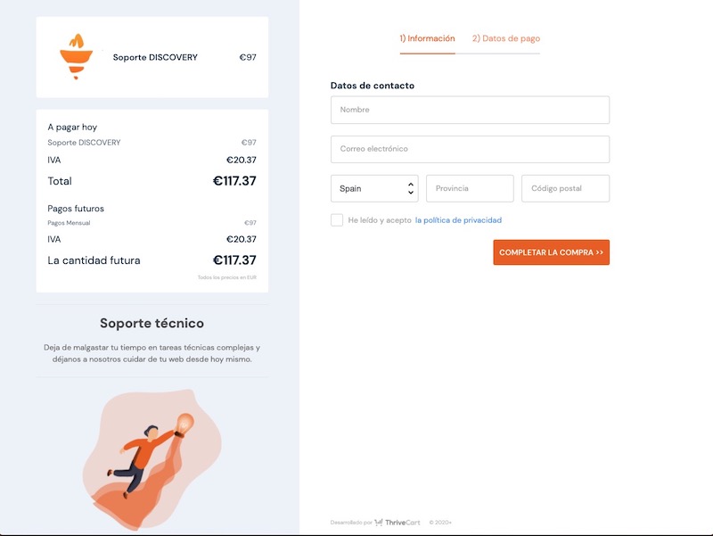 Este es un checkout a dos columnas de un sólo paso, por lo que toda la información y todos los datos se solicitan en la misma pantalla. Además, se caracteriza por incorporar una cuenta atrás para reforzar el sentimiento de escasez de la oferta bump.
