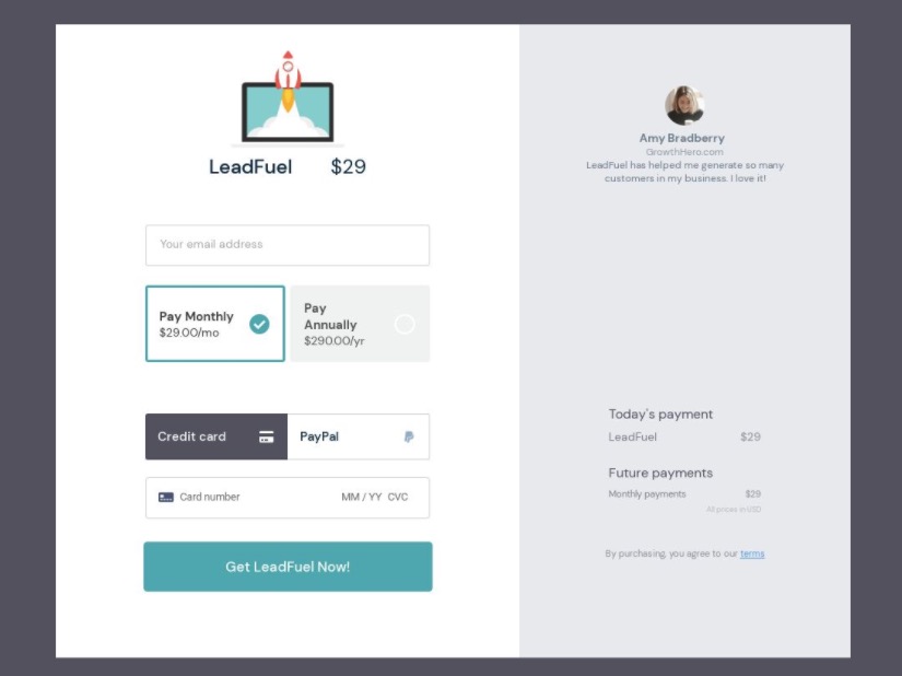 Diseño de David Crowther de checkout de un sólo paso, con testimonio incluido. Puedes utilizarlo importando el diseño desde esta dirección (y recuerda adaptarlo a tu caso): https://thrivecart.com/share/ibfpC0p/
