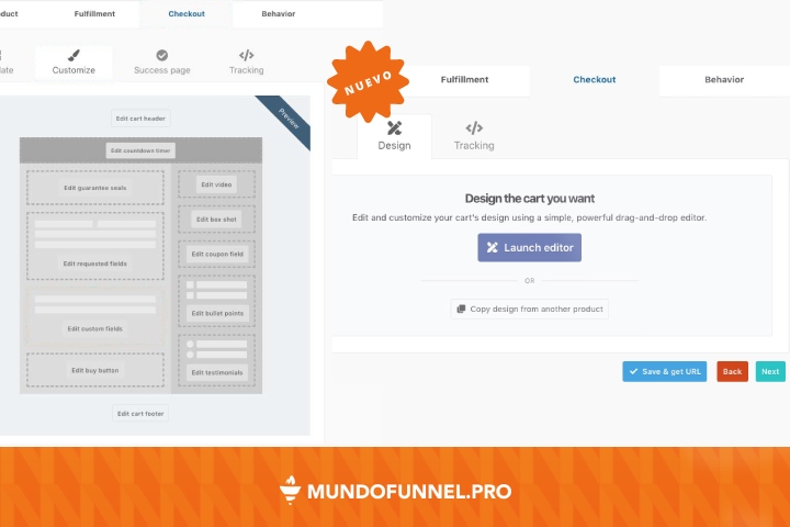 El apartado “Customize” cambia radicalmente con el apartado “Design“, que ahora incorpora un botón para lanzar el nuevo editor drag & drop y poder personalizar el aspecto del checkout.