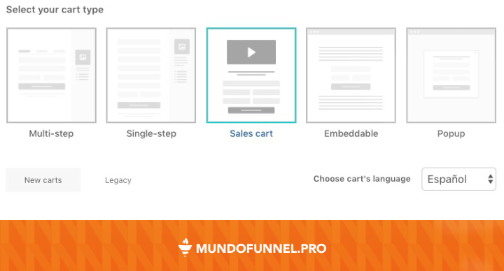 Se sustituye el apartado “Template” por el apartado “Type“, y si habilitas la opción “New carts” (en lugar del Legacy) podrás ver que además de esos 4 diseños se incorpora uno nuevo llamado “Sales cart“.