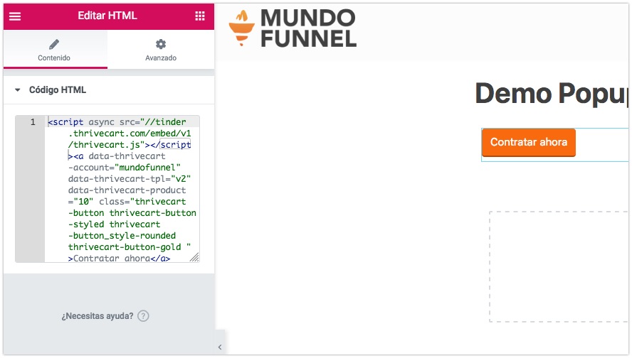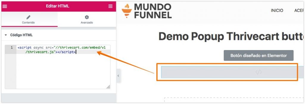 01. Integración directa: Si quieres integrar el botón de Thrivecart directamente en Elementor, solo tendrás que agregar un bloque HTML y dentro del mismo pegar el código que hemos mostrado al principio de esta entrada: