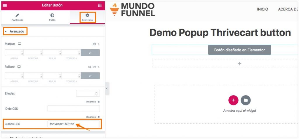 - El siguiente paso es añadir la clase “thrivecart-button” al botón creado en Elementor: